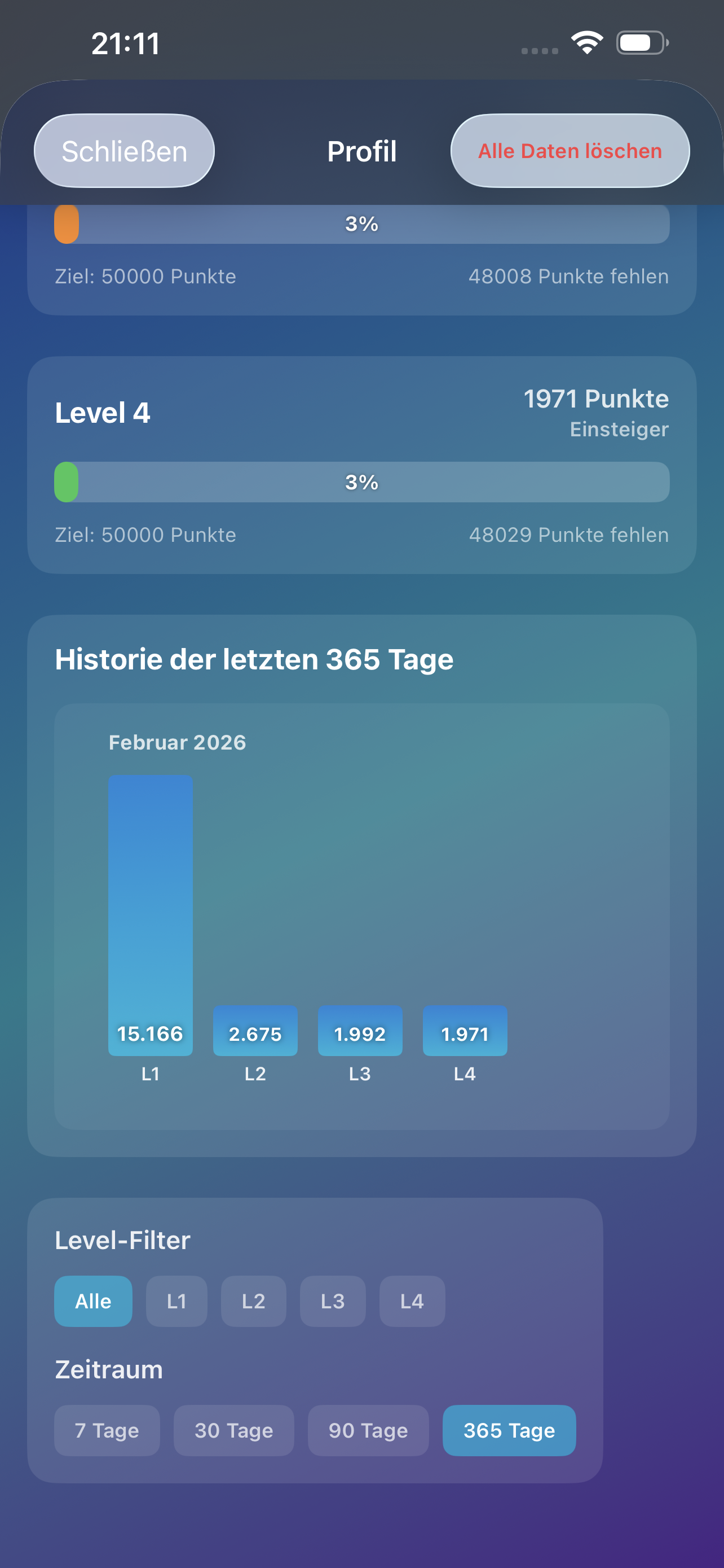 Im Profil siehst du deinen Status pro Level direkt neben dem Fortschrittsbalken.