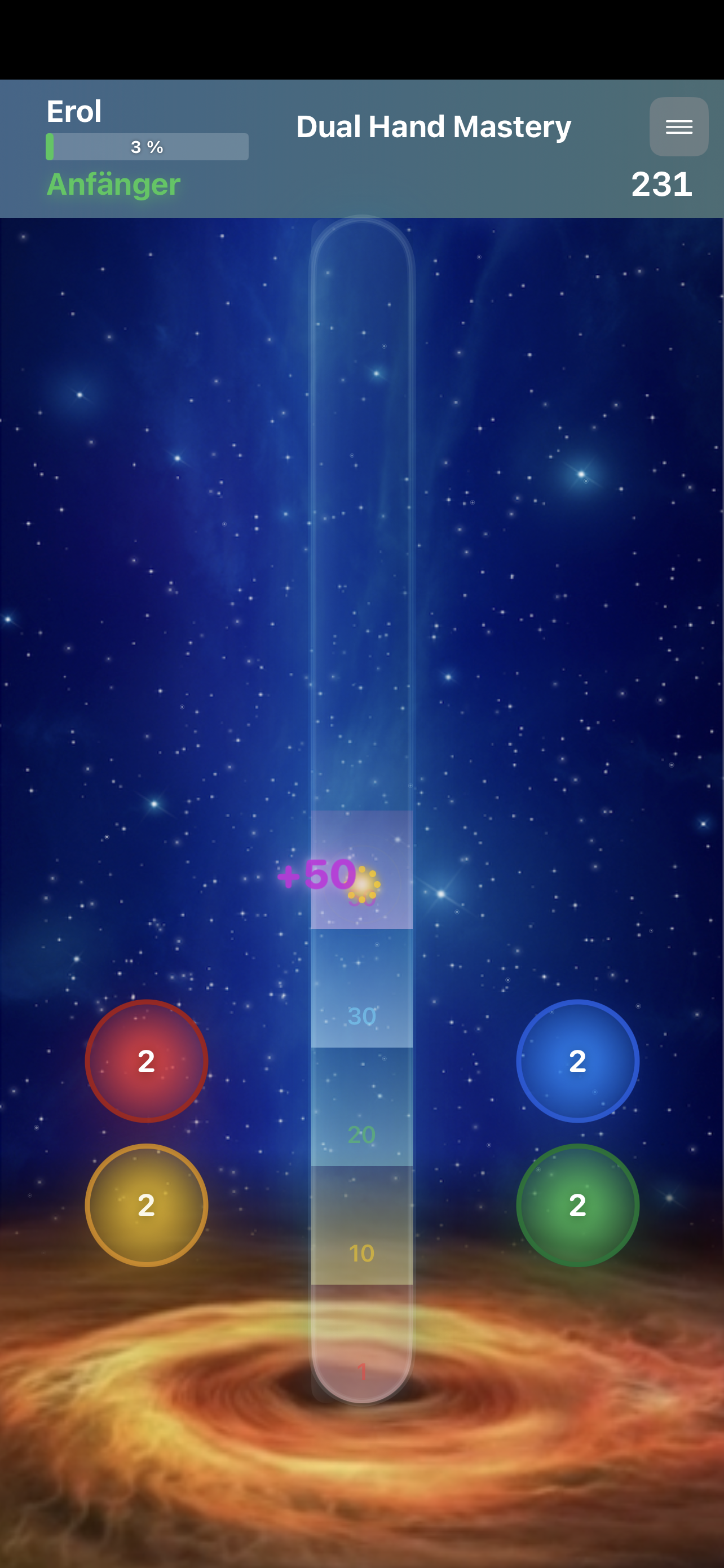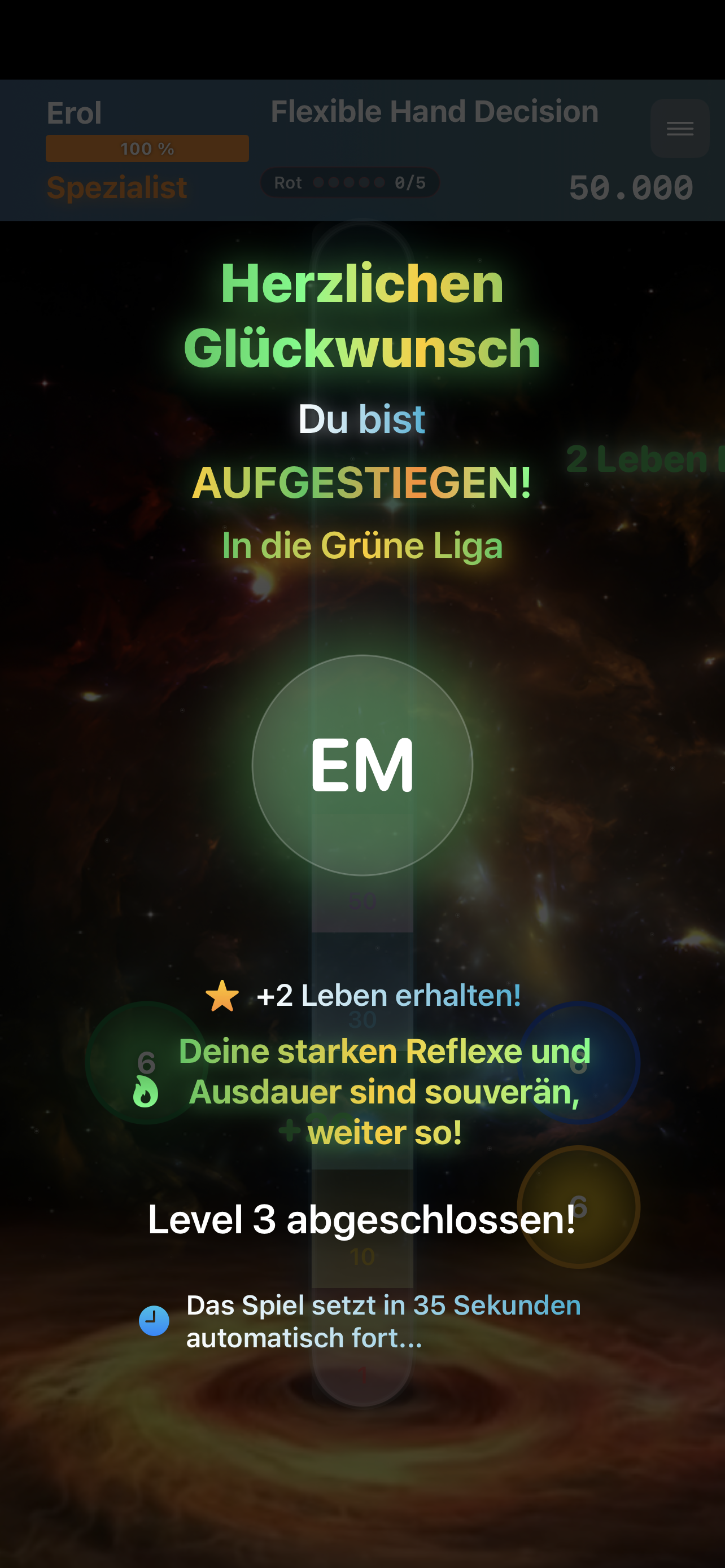 Deine Hochstufung (z.B. Neuling → Einsteiger → Anfänger ...) bleibt pro Level gespeichert – auch wenn du ein Level neu startest.